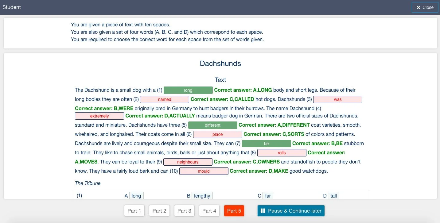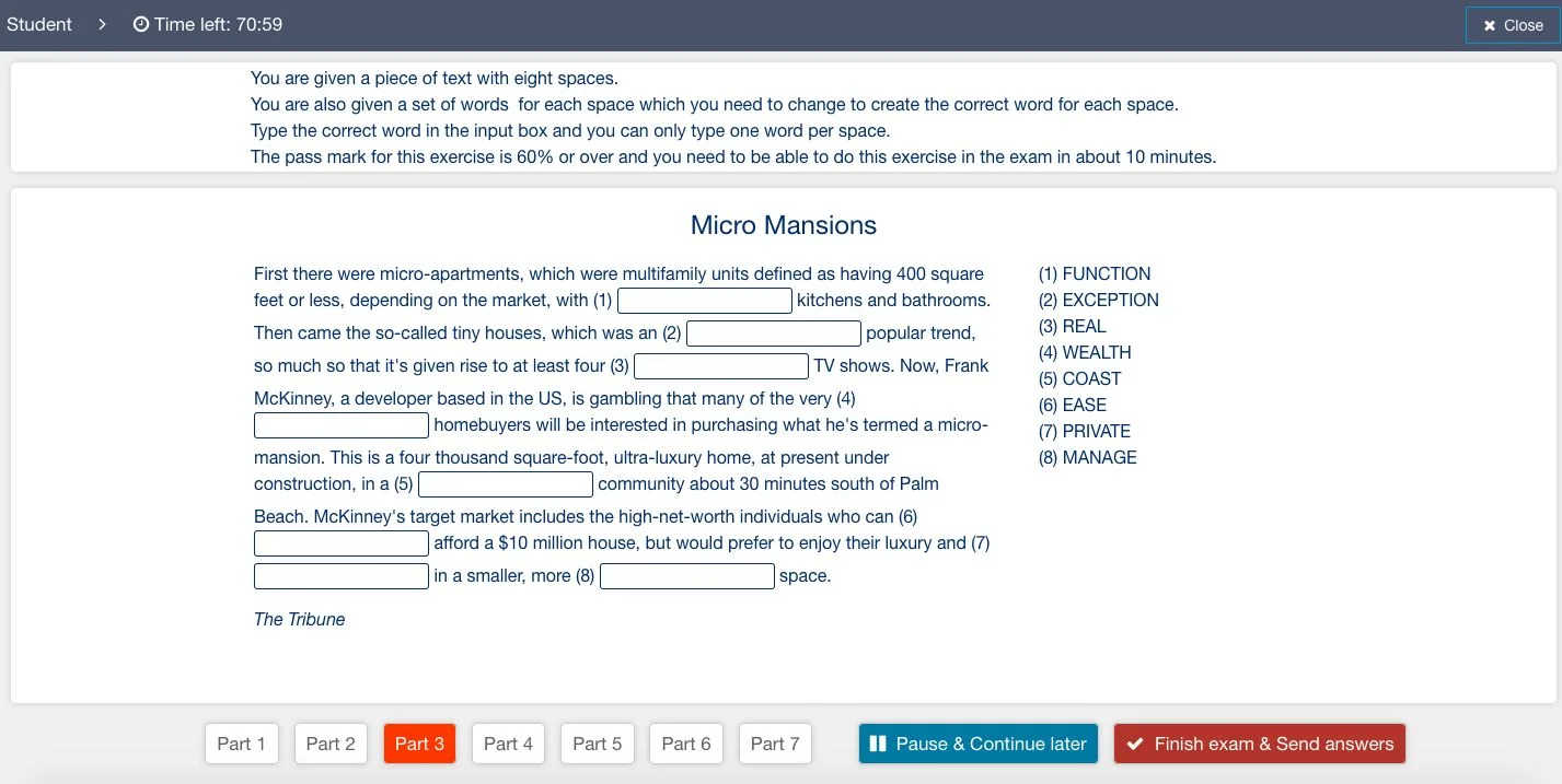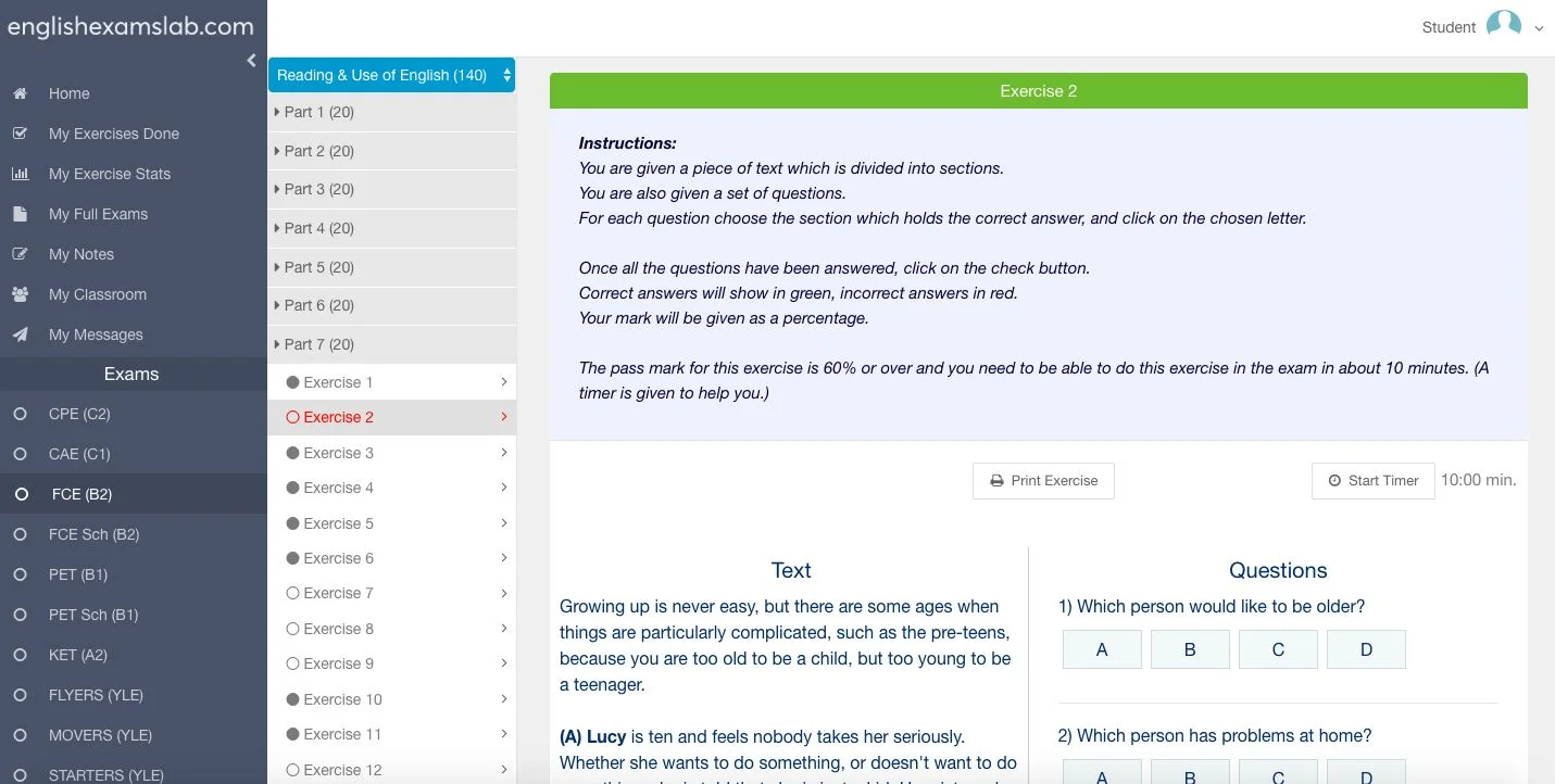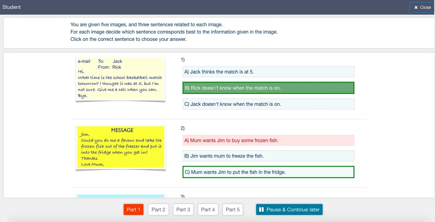Los exámenes simulados son cronometrados: un contador comienza tan pronto como los estudiantes hacen clic en el botón «Inicio» y el sistema registra el tiempo necesario para completar todas las partes del examen. También se puede pausar y continuar más adelante.