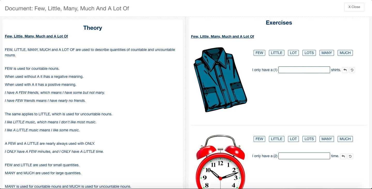 Tienes multitud de ejercicios de cada nivel. En esta tabla puedes encontrar el número aproximado de ejercicios de cada nivel. Se van añadiendo ejercicios constantemente.